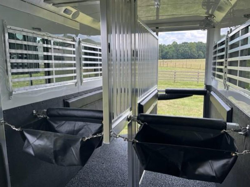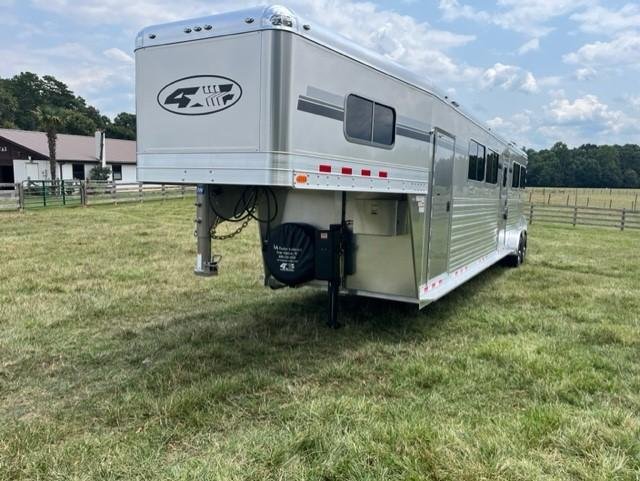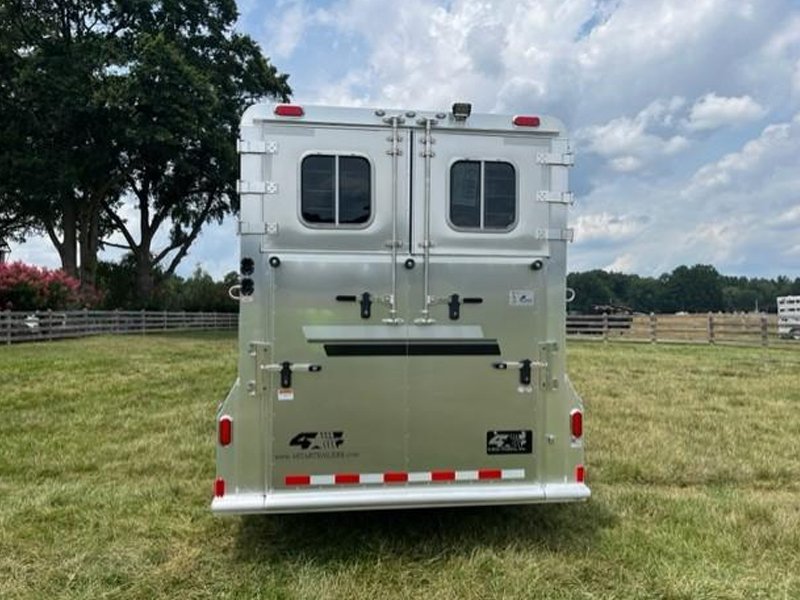 2025 4 Star 4 Horse Deluxe Head to Head with Side and Rear Ramp, Clean Coat, 7X30X8, 7000# Hydraulic Single Leg with Battery Box & Wired Up, Blocked Axles 3″ & Adjusted Fenders, 7000# Torsion Electric Brakes, 235/85R 16, 14 Ply Goodyear Tires and Spare, 16X6 Aluminum wheels, 4 Large 2X4 Windows with Heavy Duty Window Bars on CS and SS, 60″ Side and Rear New Easy Lift Ramps with Dutch Doors and Windows Above, Split Doors Over Side Ramp, Both Dividers and New Quiet Ride Removable Baby Panels with Rubber Both Sides, 84″ Stalls, 4 Butt Bars and Breast Bars with Quiet Ride System, 5 Lights Each Top Rail, 3 Light Light Cluster Nose, 3 Halogen Load Lights, 2 Additional Settings for Box Stalls, Insulated Roof, Werm Floor in Horse Compartment, 4 12 Volt Fans, Walk Out Door with Drop Window and Bars, 6′ Dressing Room/Tack with Rubber Mats on Floor and Side Ramp, Carpet on GN, Drop and Bulk Head Wall, 4 Polo Style Saddle Racks with Slip-on-Holders on SS D/R Door, 10 Bridle Hooks, 2 Brush Trays, 4 Feed Bags, 5′ Clothes Rod, Blanket Bar, All New LED Lights Inside & Out, Load and Running, Door Latch on People Door Horse Area. Graphic Sliver Metallic/Charcoal Metallic/Black Metallic-Straight Lines Through Windows with Tape on Rear Ramp. One on Order